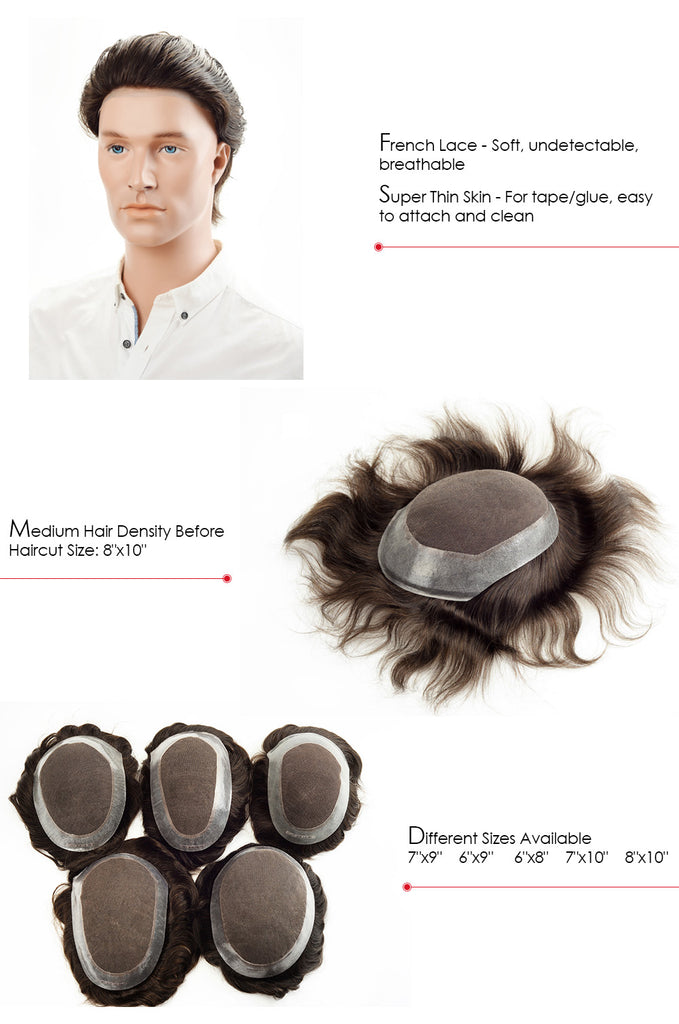 This men's hairpiece is made with soft French lace in the center and durable super thin skin along the perimeter. Helps your head remain cooler during hot weather or intense physical activity.The design of the base is easy to maintain and very suitable for first-time wearers of a hair piece. If you are looking for durable and breathable French lace hair piece (thin skin), then this hair piece is the perfect choice.